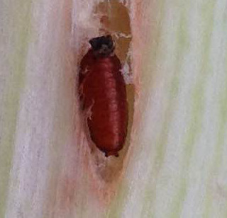 In de prei zien we in het late najaar de kleine (halve centimeter) bruine poppen in holletjes in de schachten zitten (foto). Het insect komt in de oude boeken niet voor,